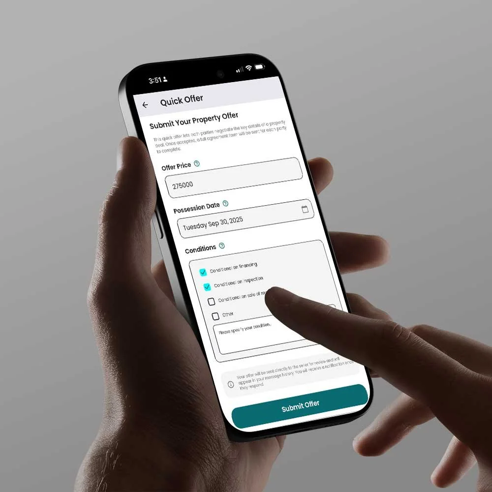 Buyers can submit offers through the app. You review, negotiate, and accept — all within the platform. Once both parties are in agreement, an “offer to purchase” document is emailed to both parties ready to take to their lawyers!